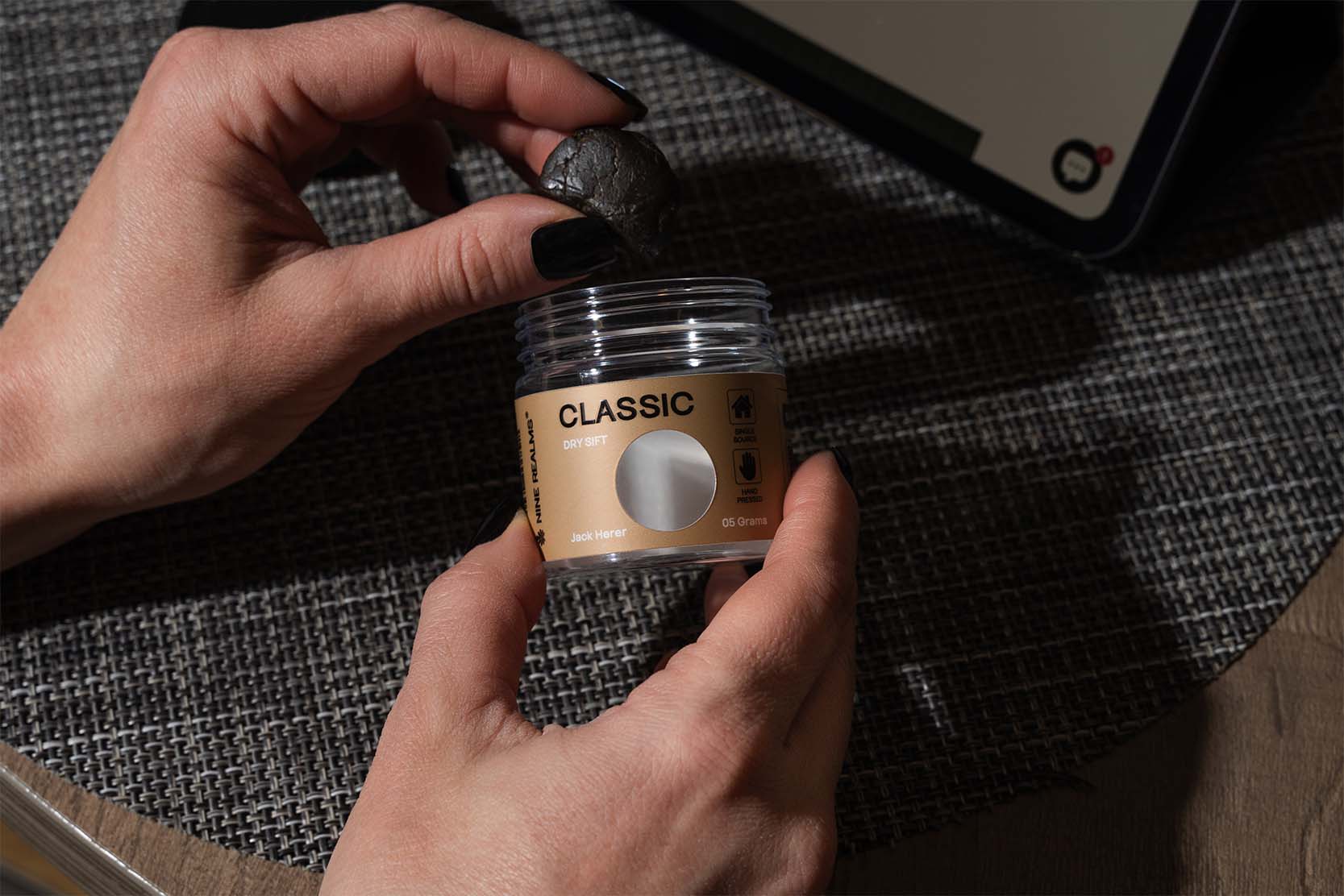 Explore the Nine Realms expertise with our classic dry sift hash, showcasing the timeless JACK HERER strain infused T9HC. This traditional dry-sift method produces a soft, crumbly texture with rich herbal and pepper notes. With THC below 0.2%, this compliant hemp product is ideal for users seeking energizing daytime effects, authentic hash character, and elevated potency. Ready to buy modern hash that honors tradition? You've found it.